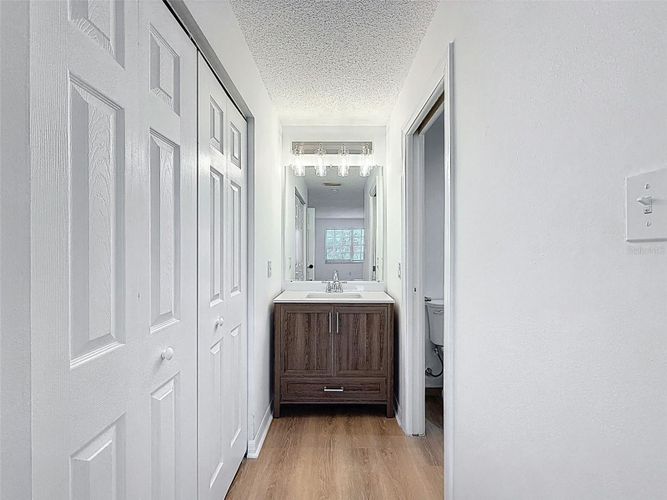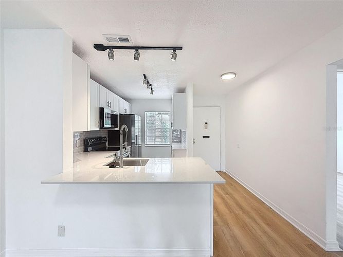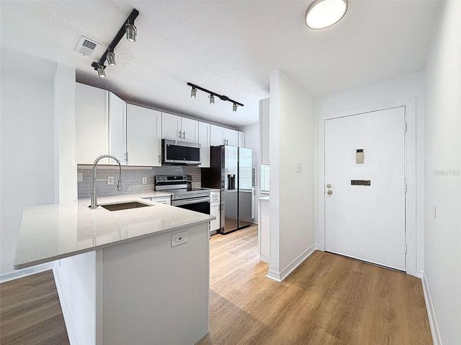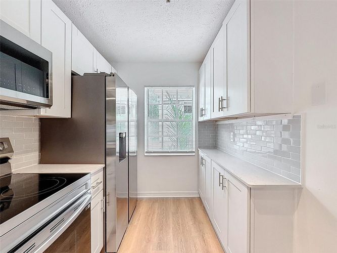 One or more photo(s) has been virtually staged. Introducing an exquisite opportunity to embrace elegant living in the esteemed gated community of Seven Springs and Country Club. Nestled in New Port Richey, this sophisticated condominium offers luxury, tranquility, and modern updated throughout its impeccable design. As you enter the home, a freshly painted and light-filled interior created an inviting atmosphere, with luxury plank flooring seamlessly connecting each room. The stunning kitchen showcases contemporary Shaker cabinets, stainless steel appliances, and eye-catching quartz countertops, setting the stage for culinary adventures. Featuring two bedrooms and two updated bathrooms, this condo provides ample space for relaxation and privacy. The master quire is a sanctuary of comfort, complete with an en-suite bathroom showcasing a walk-in shower and a stylish vanity with quartz countertop. Located just 26 miles from Tampa International Airport and 13 miles from the picturesque Fred Howard Park Beach, urban conveniences and idyllic escapes are within easy reach. Social membership includes access to a range of luxurious amenities, from dining rooms and mixed bar & grill, heated swimming pools, fitness rooms, tennis courts, pickleball and bocce ball, to charging privileges, discounted green fees, and exclusive member-only events. Embrace the seamless blend of luxury, comform, and convenience. Welcome home!
